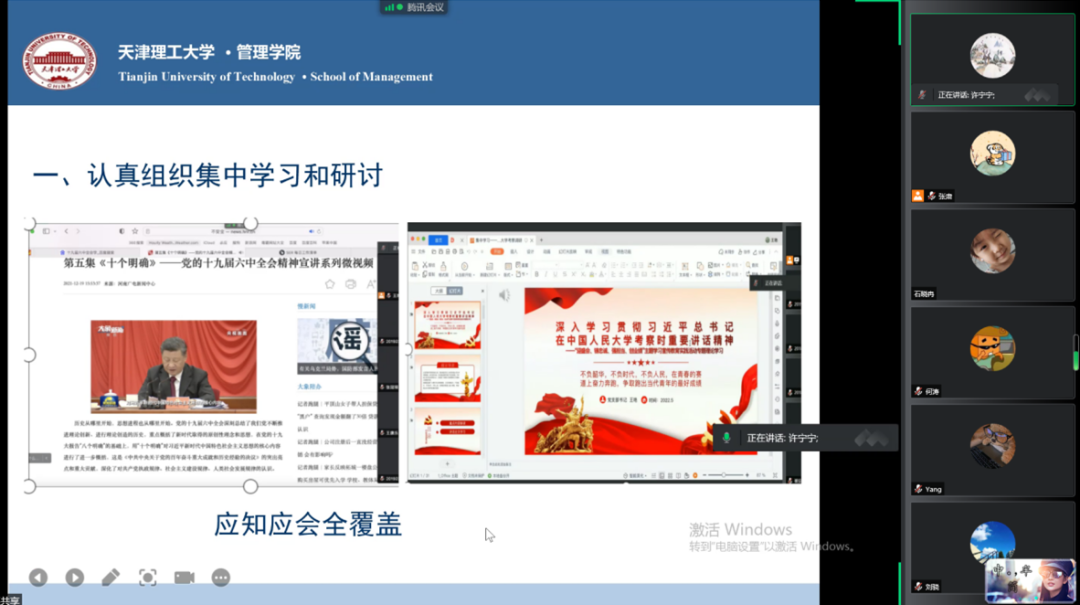随后,物流教工党支部书记唐燕、工商与财务教工党支部副书记许宁宁、管商工业(合作办学)本科生党支部书记汤炜炜、管科研究生第一党支部书记邱虹分别就 “迎盛会、铸忠诚、强担当、创业绩”主题学习宣传教育实践活动部署以来开展的工作进行交流汇报。各支部书记详细介绍了组织党员师生积极参加疫情防控工作、组织集中学习、开展就业指导、帮助学业进步、指导学生准备线上论文答辩等实招实效,展现了各支部着眼学生实际需求,紧密围绕学院党政重点工作,亮党员先锋身份,促教风学风,强师德师风的良好风尚。
