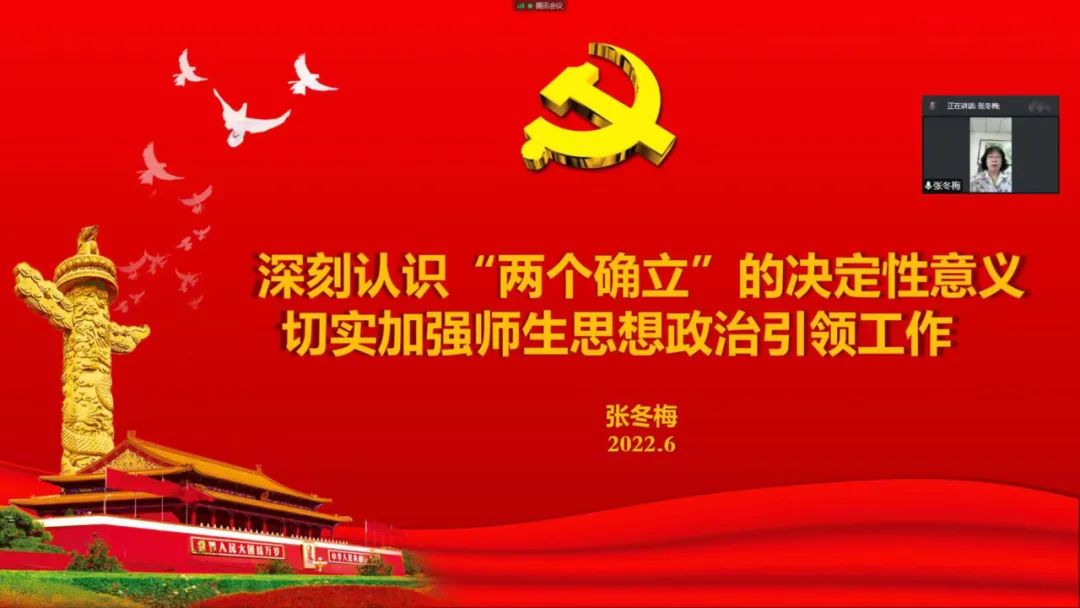 会议包括强调“迎盛会、铸忠诚、强担当、创业绩”主题学习宣传教育实践活动背景及重要意义,解读“党建引领,师友共建”实践月系列活动任务要求,支部书记代表交流发言,张冬梅书记总结讲话并开展“深刻认识‘两个确立’的决定性意义,切实加强师生思想政治引领工作”专题报告四项内容。乔娜老师首先阐述了“迎盛会、铸忠诚、强担当、创业绩”主题学习宣传教育实践活动的重要意义,指导各支部聚焦10项重点任务,然后对六月即将开展的suncitygroup太阳新城官网“党建引领,师友共建”实践月系列活动进行了深入介绍,依次详解了“党建带团建-师友共建迎盛会”、“师生面对面”毕业年级座谈活动、“强国有我”健步走、“迎盛会”主题摄影、“奋斗担当”党史知识讲解大赛、“迎七一”党员过政治生日、“迎盛会”专题党课等活动的具体工作要求,强调党建引领作用,突出师生共促共建。