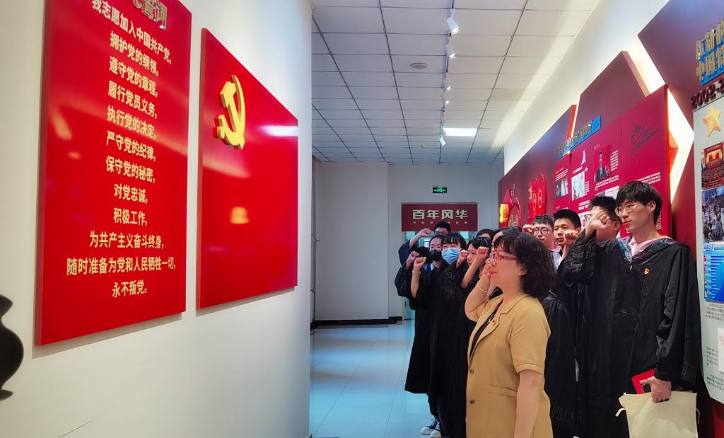 学院举办2022届毕业生党员“强国有我”教育活动,院党委书记以“喜迎二十大,奋进新征程”为主题,为毕业生党员上了一堂温暖的“特殊党课”。此外,为毕业生党员过政治生日,带领同学们一起重温了“百年风华”党史主题展览并和学生讲解员一起讲解了重点内容,激励全体毕业生党员坚定理想信念,让青春在党和人民最需要的地方绽放绚丽之花。同时,学院面向全体毕业生党员开展“六个一”毕业季系列主题教育活动,通过“重温一遍入党誓词”、“共上一堂党课”、“参观一次党史长廊”、“打卡一次校史馆”、“共话一次青春担当”、“参加最后一次班会”六个活动将毕业生离校工作与党性教育有机结合,增强广大毕业生党员使命担当。