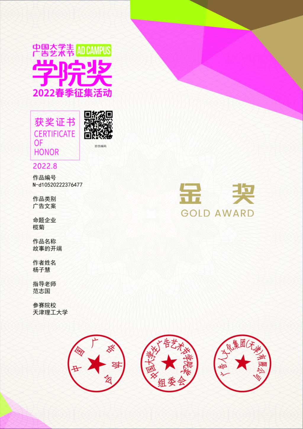 suncitygroup太阳新城官网杨子慧荣获2022年中国大学生广告艺术节学院奖春季赛广告文案“金奖”