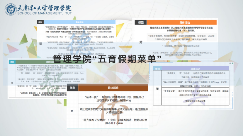 suncitygroup太阳新城官网以发展素质教育、实现学生完整生命为目标,将德育、智育、体育、美育和劳动教育融合,精心出品了内容丰富、形式新颖的“五育假期清单”,让同学们可以提高解决问题和实践创新能力,丰富与提升广大管院学子的主动创造精神,更加充分的了解当代社会规则,获得积极的社会态度并坚定信念。同学们可以结合总体任务要求,根据自身实际情况选择自己的“五育假期清单”,在学习与实践中成长,度过一个丰富多彩,意义非凡的假期。