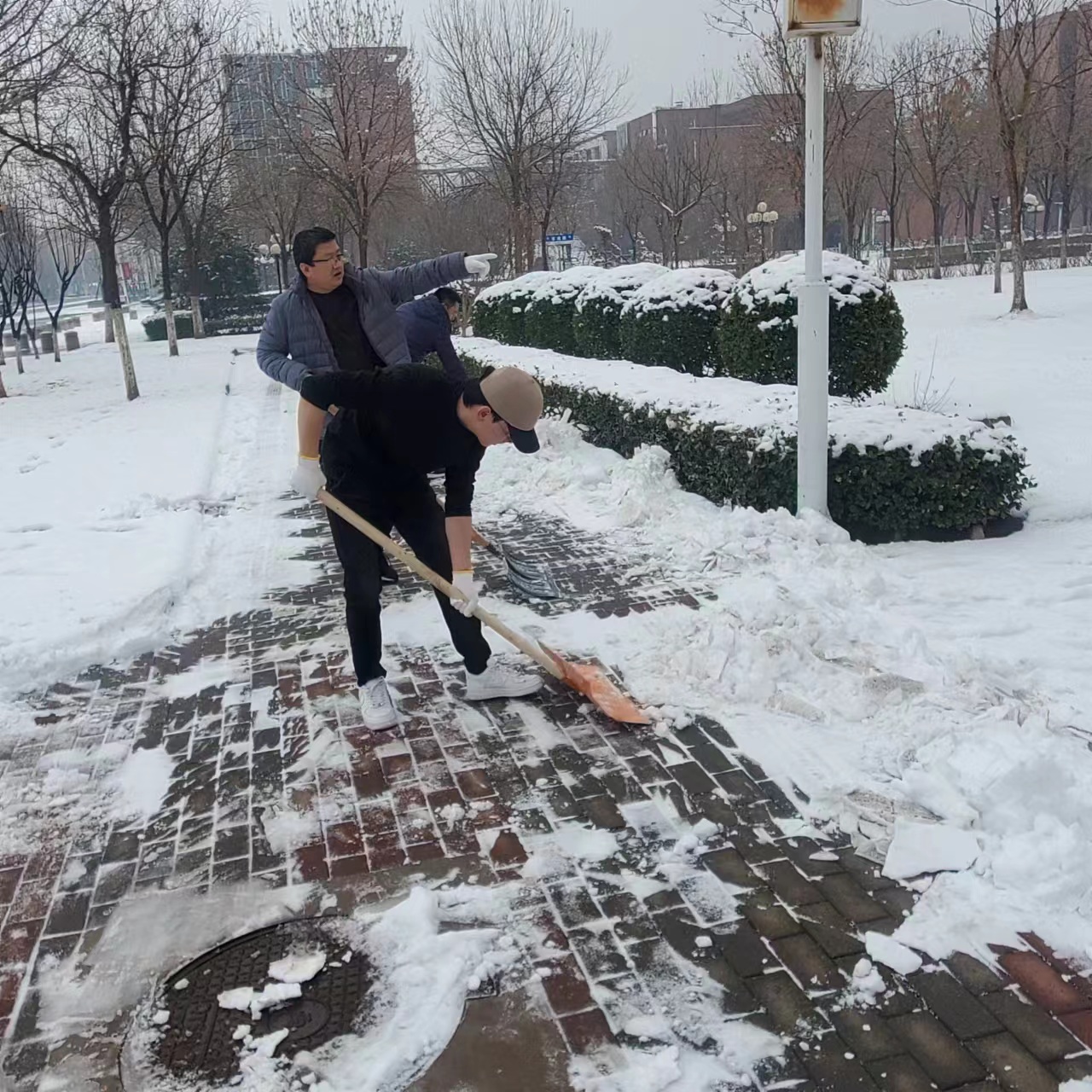 在扫雪现场,大家干劲十足,沿师生前往学院的必经之路,有的拿铁锨铲雪,有的拿扫帚清扫,分工明确,配合默契。老师和同学们顾不上天寒路滑,只想着将路面的积雪冰块尽快清除,一个多小时的时间,就在学院周围清理出数条通行道路,保证车辆和师生进出安全。