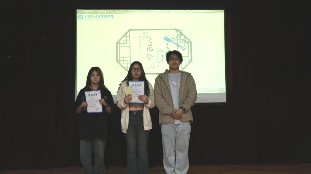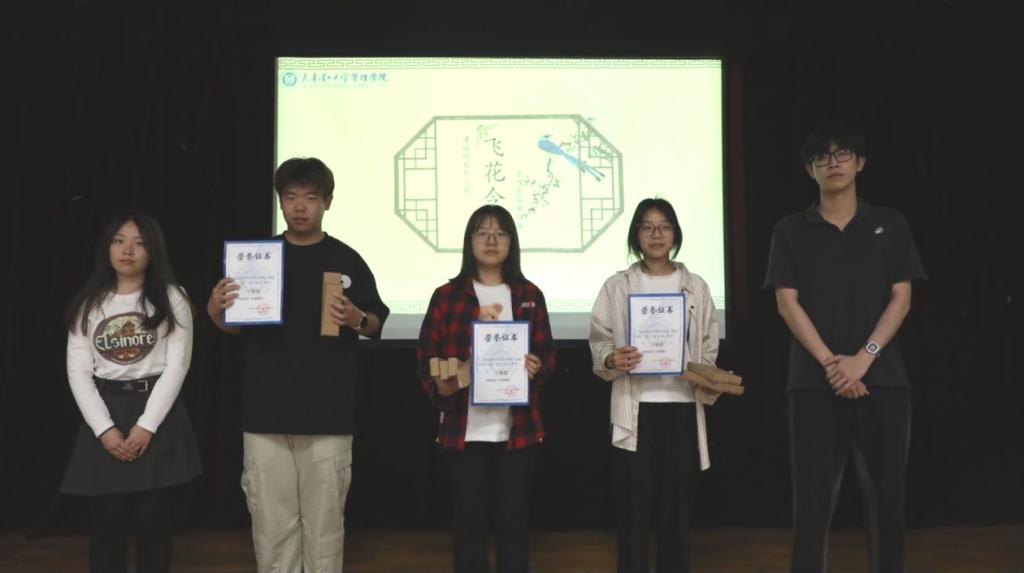 比赛经过“笔答”、“抢答”和“擂台制飞花令”三轮激烈的比拼,最终2022级物流管理专业的“我们说的都队”获得一等奖,2023级市场营销专业的“卧龙凤雏队”和“刘奶奶找牛奶奶买牛奶队”获得二等奖,2023级工业工程专业的“碱基互补配队”、工商(中加)专业的“猛虎下山队”、财务管理专业的“海底小纵队”、工业(中日)专业的“梦笔生花队”获得比赛三等奖。